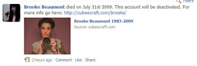 I dunno why this is affecting me so much, but it's not often in my life that I meet someone and then the next time I hear of them they're dead. Anyways, here's a facebook snippet of Brooke Beaumont. A total fuckin' shame.